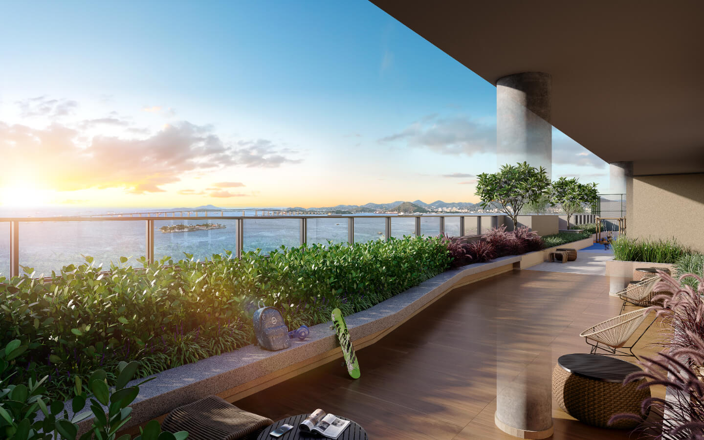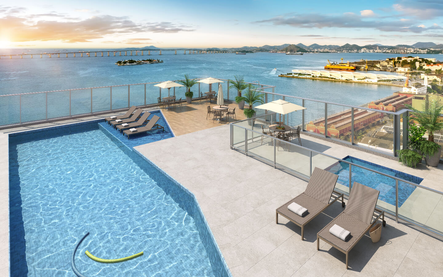 Piscinas, academia, salão de festas e um mirante para apreciar a Baía de Guanabara. Tudo isso sem sair de casa.